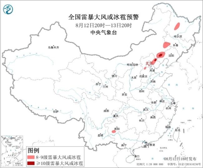 中央气象台同时继续发布强对流天气黄色预警,预计8月12日20时至13日20时,内蒙古东南部、东北地区西部、华北北部、西南地区东部等地的部分地区将有8级以上雷暴大风或冰雹天气,其中,辽宁西部、河北东北部等地的部分地区将有10级以上雷暴大风,最大风力可达11级以上。此外,内蒙古东南部、东北地区西部、华北中北部、江淮西部、江汉、江南西北部和中东部、西南地区东部和南部、华南东部和南部等地的部分地区将有小时雨量大于20毫米的短时强降水天气,其中,辽宁西部、河北东北部、北京东北部、天津北部、河南南部、湖北南部、湖南北部等地的部分地区小时雨量大于50毫米,最大可达70毫米以上。