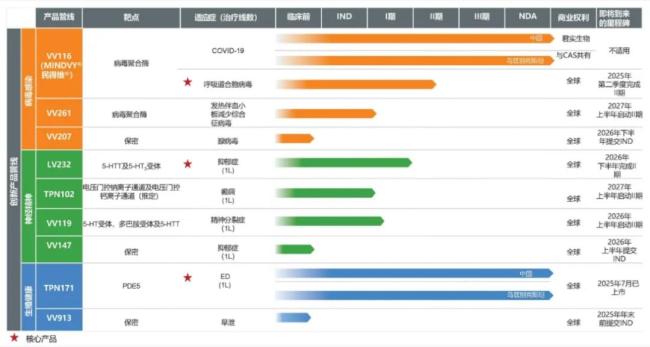 旺山旺水的管线布局围绕着生殖健康、病毒感染、神经精神三个领域,共发展出9款创新药管线,其中包含三款核心产品,分别是用于治疗COVID-19的民得维(VV116)、用于治疗抑郁症的LV232,以及用于治疗ED的昂伟达(TPN171)。