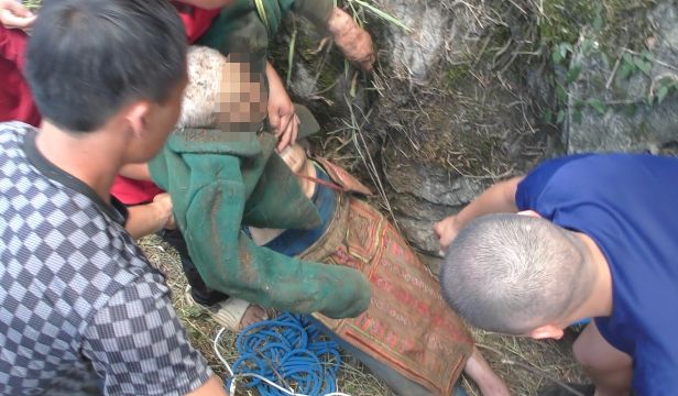 一名九旬老人不慎坠入狭窄洞穴