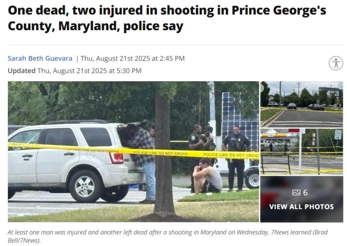 中新网8月21日电 综合美国福克斯新闻网等报道,当地时间20日,美国马里兰州乔治王子县发生枪击事件,目前已导致1人死亡,另有2人受伤。