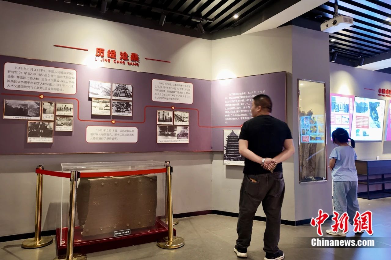 游客参观钱塘江大桥陈列馆内的展品。钱晨菲 摄