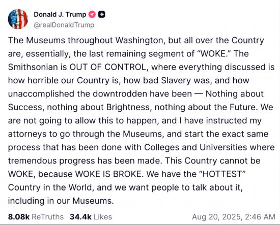 特朗普宣布对史密森学会旗下博物馆进行调查的社交媒体发文截图