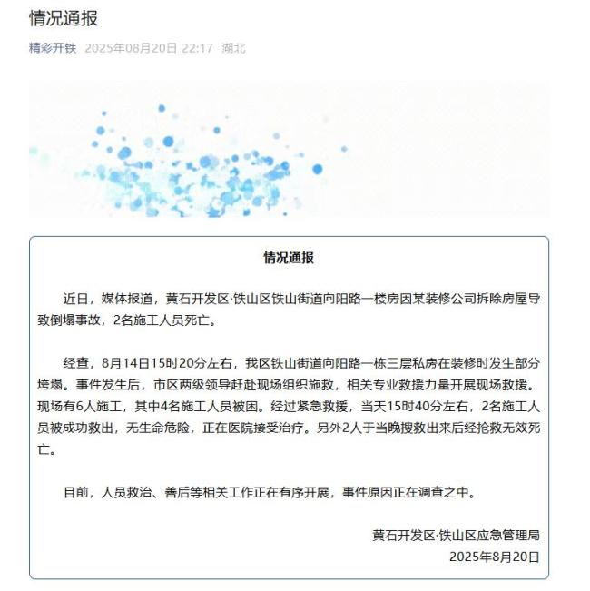 湖北一公司拆除房屋致楼房倒塌致2死 事故原因正在调查!近日,媒体报道黄石开发区·铁山区铁山街道向阳路一栋楼房因某装修公司拆除房屋导致倒塌事故,造成2名施工人员死亡。