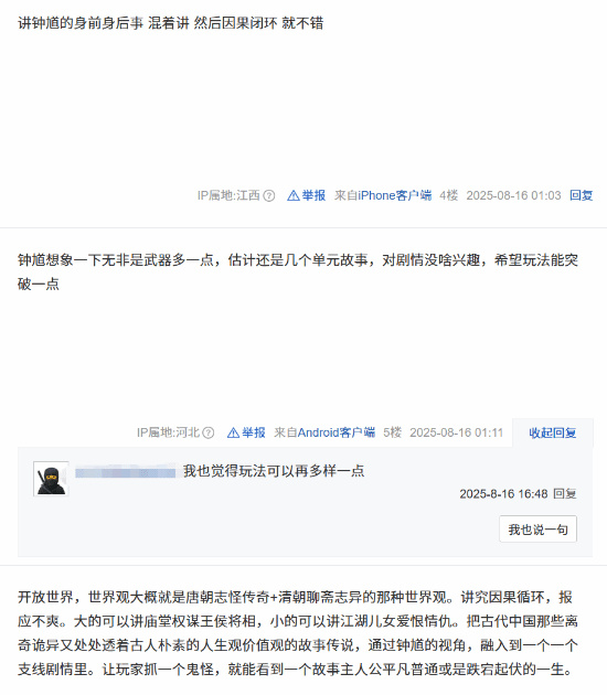 资深玩家前一秒还在《悟空》里与妖王激战,后一秒就开始研究《山海经》和《聊斋志异》,探讨钟馗的故事线如何与西游梦幻联动,期待其他神话人物登场。他们恨不得立刻成为游戏科学的编剧,为钟馗设计背景故事和技能树。