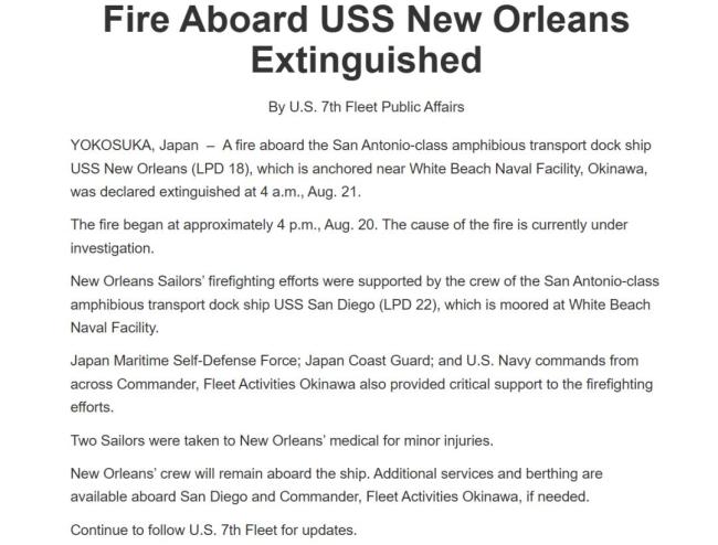 8月21日,美国海军第七舰队发布公告称,其驻扎在日本的“新奥尔良”号两栖船坞登陆舰于8月20日16时发生火灾,最终在次日凌晨4时被扑灭,事故造成2人轻伤。此次美军舰艇的火灾持续了12小时。