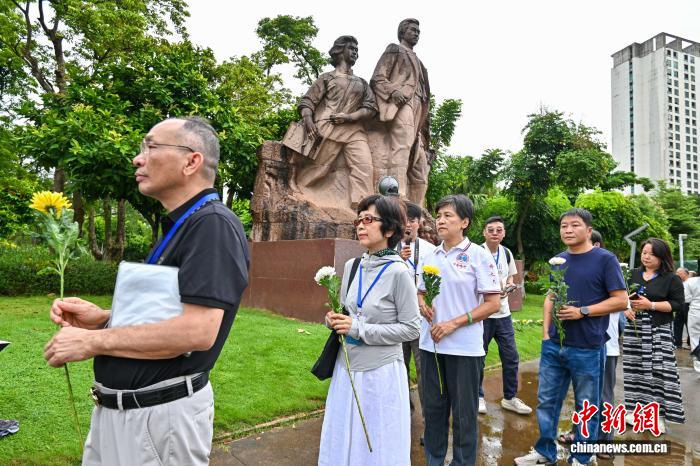 8月25日,海南海口,参加2025海外华文媒体海南采访行活动的海外华媒代表,与南侨机工、琼崖华侨回乡服务团后人等,向《南洋华侨机工回国服务团》《琼崖华侨回乡服务团》两座雕塑默哀、献花,追忆华侨回国支持抗战。中新社记者 骆云飞 摄