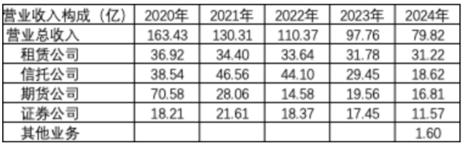 从具体业务收入来说,2024年各个板块的业务均比2020年都有所下滑,其中下滑最明显是信托和期货公司。