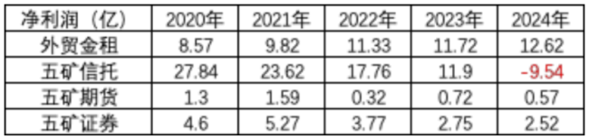 从净利润来看,五矿资本过往的业绩主要是信托和外贸金租贡献,2024年盈利下滑主要是五矿信托业绩暴雷,亏损9.54亿。