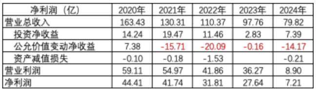 从五矿资本的收益表可以看出,净利润下滑有收入减少的因素,还有投资的因素,2022年-2024年投资净收益减少比较明显,公允价值变动收益也亏损较大。