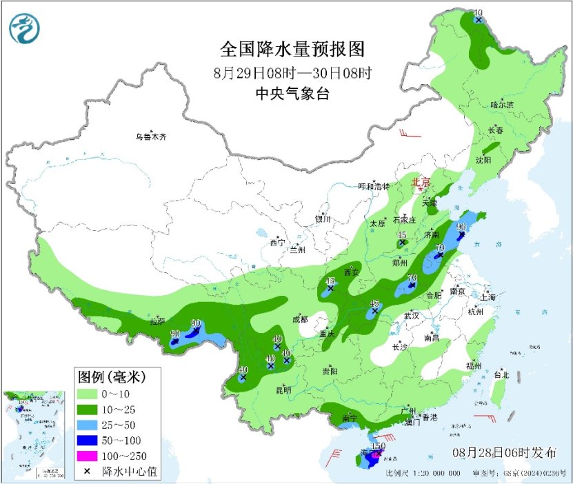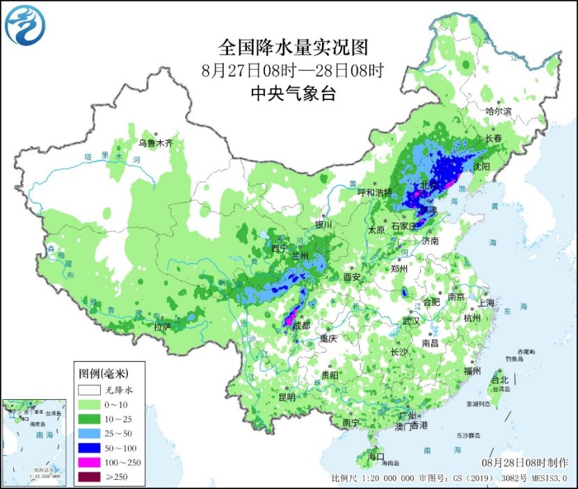 首先,关注降水方面。昨日,四川盆地西部和川西高原北部、青海东北部、甘肃南部、宁夏南部、山西东北部和南部、河南西北部、内蒙古东南部、河北大部、山东西北部、北京、天津、辽宁西部等地出现大到暴雨,其中河北保定、沧州和秦皇岛,北京房山、大兴、门头沟,天津宝坻和武清,辽宁葫芦岛和朝阳等局地出现大暴雨,四川雅安、成都和阿坝局地大暴雨或特大暴雨。