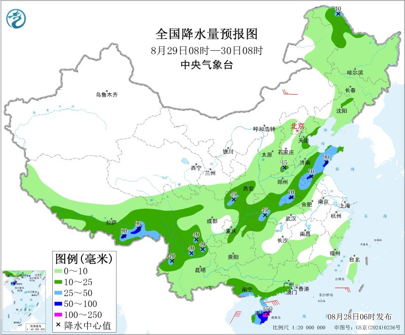 预计,8月28日08时至29日08时,吉林东部、辽宁中东部、西藏东南部、甘肃东部和南部、陕西中南部、山东中北部、河南西部、湖北西北部、川西高原、四川盆地西部和南部、云南东北部、广东中西部等地部分地区有大到暴雨,其中,四川盆地西部、广东西南部沿海等地局地有大暴雨(100~200毫米)。上述部分地区伴有短时强降水(最大小时降雨量20~50毫米,局地可超过70毫米),局地有雷暴大风等强对流天气。中央气象台8月28日06时发布暴雨蓝色预警。