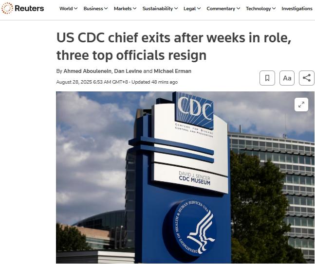 据报道,美国疾控中心医疗官员黛布拉·霍里、免疫与呼吸道疾病中心主任德米特·达斯卡拉基斯、美国国家新发与人畜共患传染病中心主任丹·杰尼根均已辞去职务。