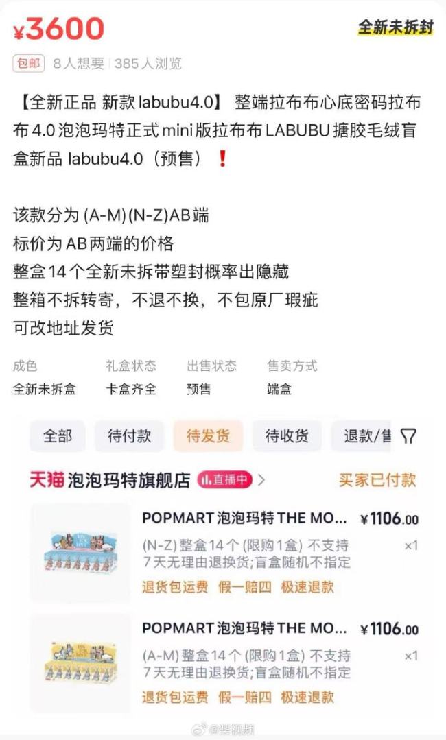 同时,二手交易平台出现大量商家加价销售迷你Labubu的情况。多名商家的报价在1700元至2000元不等,有商家对A-M和N-Z两套盲盒开出了3600元的价格,较官方定价高出1388元。对于二手平台高价炒作的情况,泡泡玛特客服表示,会进行记录,抱歉未能给消费者带来愉快的购物体验。