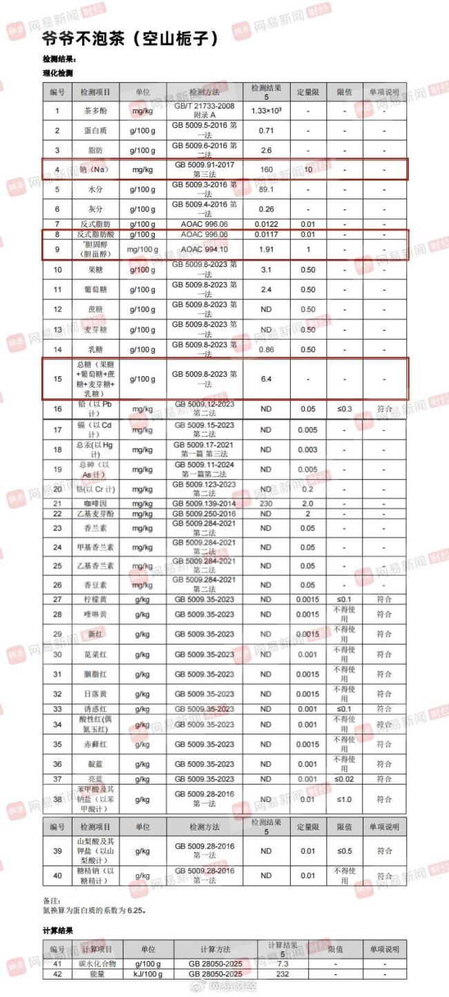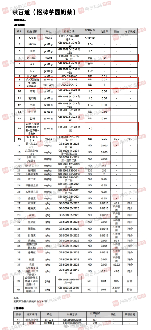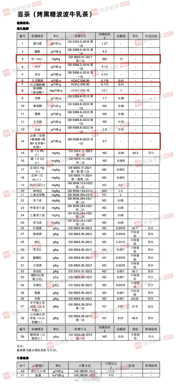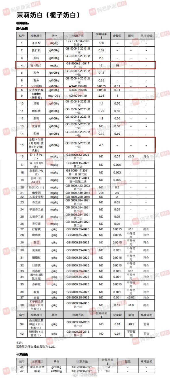 此次网易财经送检的奶茶品牌和产品分别为喜茶(烤黑糖波波牛乳茶)、奈雪(金色山脉珍珠奶茶)、蜜雪冰城(珍珠奶茶)、茉莉奶白(栀子奶白)、霸王茶姬(伯牙绝弦)、爷爷不泡茶(空山栀子)、沪上阿姨(浅浅清茉莉针王清乳茶)、茶百道(招牌芋圆奶茶)。