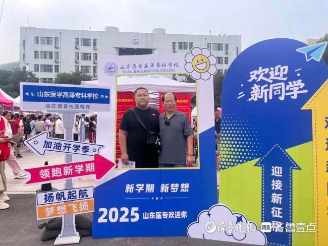 8月30日,山东医学高等专科学校济南校区迎来2025级新生报到首日。在熙熙攘攘的迎新人群中,一对特殊的新生格外引人注目——来自山东济南的52岁乡村医生周伦,不仅陪儿子周科研前来报到,自己也以新生身份同步入学,父子二人成功考取该校同一专业(针灸推拿),成为校园里一段别样的佳话。