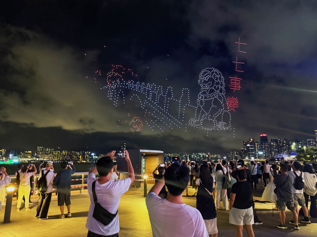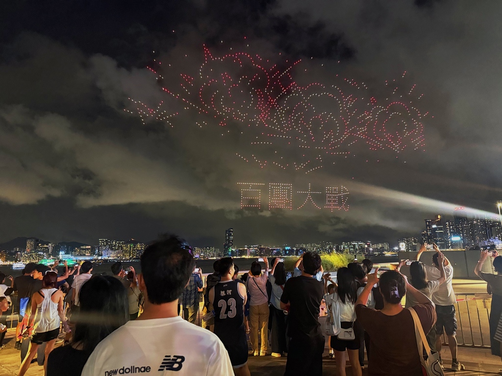 表演开始时,无人机首先拼凑出“九一八勿忘国耻”的字样,随后展示了卢沟桥“七七事变”、东江纵队持枪作战等图案,结合现代科技和艺术,讲述了中国人民奋勇抗战的历程。其中一幕再现了1945年8月15日一份报纸头版上印着“日本投降矣!”字样的画面。整个表演持续约15分钟,吸引了许多市民提前到场占位,并在表演期间高举手机拍摄留念。