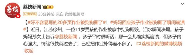 暑假作业被狗撕碎 男孩边哭边揍 孩子内心强大迅速调整!近日,在江苏徐州,一名11岁男孩的作业被家里的狗狗撕毁,他顿时泪流满面。孩子的妈妈孙女士表示,孩子平时很听话,当时确实非常难过,但很快调整了情绪,现在已经补做了大部分作业。