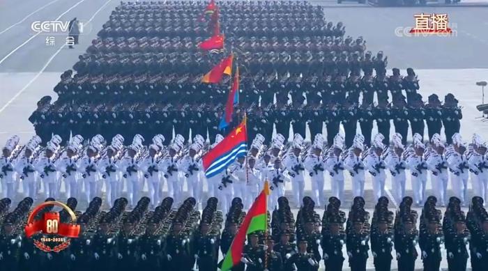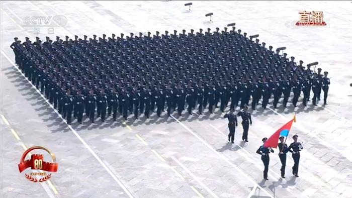 以徒步方队为例,受阅官兵按密集队形排列成威武雄壮的铁血方阵,即使原地不动,也能给观者以排山倒海、血脉贲张的极强感官冲击。