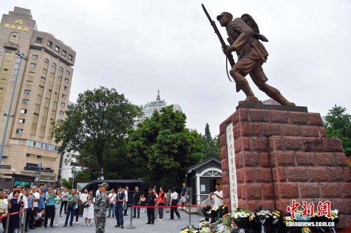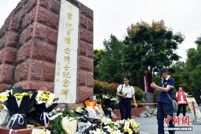 9月3日,在成都市人民公园川军抗日阵亡将士纪念碑前,市民和游人驻足瞻仰献花。中新社记者 王磊 摄