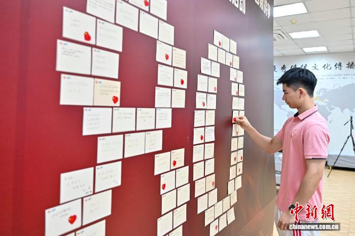 图为香港学生在留言墙上留下对祖国的祝福。中新社记者 陈骥旻 摄
