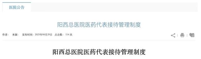 以往,医院通常要求临床、医技科室“不少于2人”参与医药代表接待即可。8月29日,阳西总医院人民医院发布的《阳西总医院医药代表接待管理制度》,明确要求“原则上应组织安排不少于3名人员参与接待”。