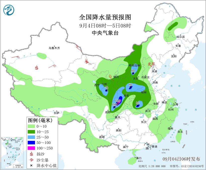 9月4日08时至5日08时,黑龙江西部、内蒙古中部、青海东部、甘肃中东部、宁夏大部、陕西、山西、四川盆地北部、河南、湖北北部等地的部分地区有中到大雨,其中,甘肃东南部、四川盆地北部、陕西南部和东部、山西西北部、湖北中西部等地的部分地区有暴雨到大暴雨(100~180毫米)。新疆北疆东部和南疆盆地、青海西部、内蒙古西部、甘肃河西、宁夏、陕西北部等地的部分地区有5~7级、阵风8~10级的大风,山口地区风力可达12级左右。新疆东部和南部、内蒙古西部、甘肃西部、青海西北部等地的部分地区有扬沙或浮尘天气,局地有沙尘暴。