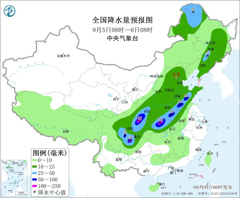 9月5日08时至6日08时,内蒙古东北部、东北地区大部、西北地区东部、华北大部、黄淮、江淮西部、江汉大部、西南地区东部等地部分地区有中到大雨,其中,四川盆地北部和南部、陕西南部、湖北北部和西部、河南东部和南部、安徽北部、江苏北部、山东中南部等地部分地区有暴雨或大暴雨(100~180毫米)。