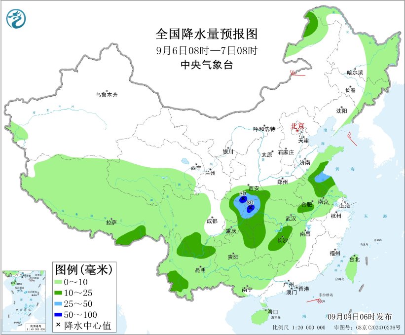 9月6日08时至7日08时,陕西南部、四川盆地东北部、重庆中东部、湖北西部、贵州东部、湖南中北部、山东南部、云南西部等地部分地区有中到大雨,其中,陕西南部、重庆东北部等地部分地区有暴雨(50~80毫米)。内蒙古中部部分地区有5~6级风。