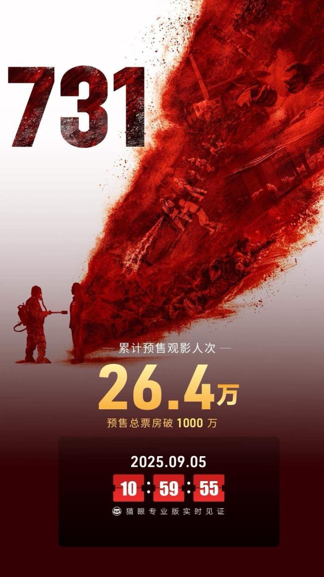 电影《731》在映前13天预售总票房突破1000万,观众对这部影片的热情高涨。该片于9月4日开启预售,截至9月5日上午11时,预售观影人次超过26万,上映首日即9月18日的预售场次突破了10万场。
