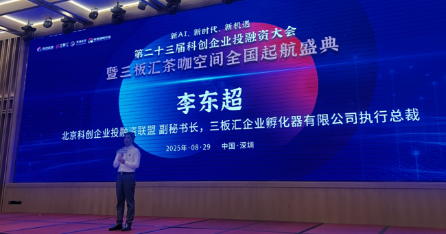 2025年8月29日至30日,以“新AI、新时代、新机遇”为主题的“第二十三届科创企业投融资大会暨三板汇茶咖空间全国启航盛典”在深圳隆重举行。本次大会由中国国际科技促进会、欧美同学会企业家联谊会联合指导,中国国际科技促进会专精特新与挂牌上市工作委员会与北京科创企业投融资联盟联合主办,三板汇投资顾问集团、海通实业投资集团、三板汇(深圳)股权投资基金有限公司等共同承办,并获中国港澳台侨国际融合发展集团、中华网、香港中华工商总会、香港商报、INBM证券服务频道《浩说产融》栏目、中国产业金融发展控股集团、深圳市芯片科技促进会、深圳上市公司并购协会、深圳市新三板上市企业协会、深圳U8智造产业园等机构协办,广东电视台提供媒体支持。大会汇聚了来自国家部委的十余位领导、全国八十多个省市政府代表、众多投资机构、科创企业及行业专家,超800人参会,共同探讨科创领域的未来路径与合作机遇。
