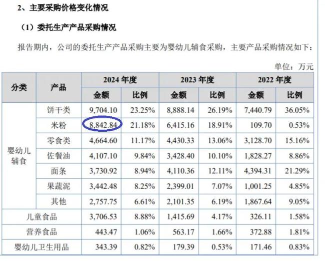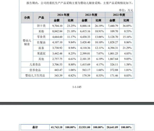 值得注意的是,2024年英氏委托加工产品采购总金额为4.17亿元,其中饼干类采购金额9704.1万元,位居采购金额第一位。排名第二的就是委托生产的米粉业务,采购金额为8842.84元(不含税)。