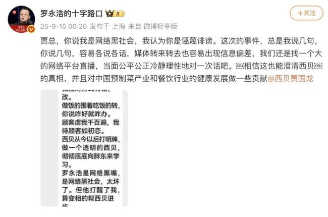 14日晚,罗永浩在交个朋友直播间直播时谈到了贾国龙的上述表态截图。他表示,白天看到截图后觉得贾国龙有这个态度挺好,但后来才知道,截图还有后半部分,贾国龙称其为“网络黑嘴”。当晚,罗永浩发布微博回应:“嗯,我刚看到后面被截掉的一半了,好,贾国龙,那这件事我们没法揭过去了。在中间再劝我的朋友,我们一律绝交吧。”随后,罗永浩深夜再发微博喊话贾国龙:“我们还是找一个大的网络平台直播,当面公平公正冷静理性地对一次话吧。”