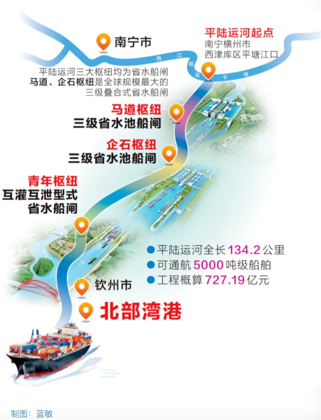 平陆运河始于南宁横州市西津库区平塘江口,经钦州灵山县陆屋镇沿钦江进入北部湾,全长约135公里,通航5000吨级船舶,项目估算总投资约727亿元。