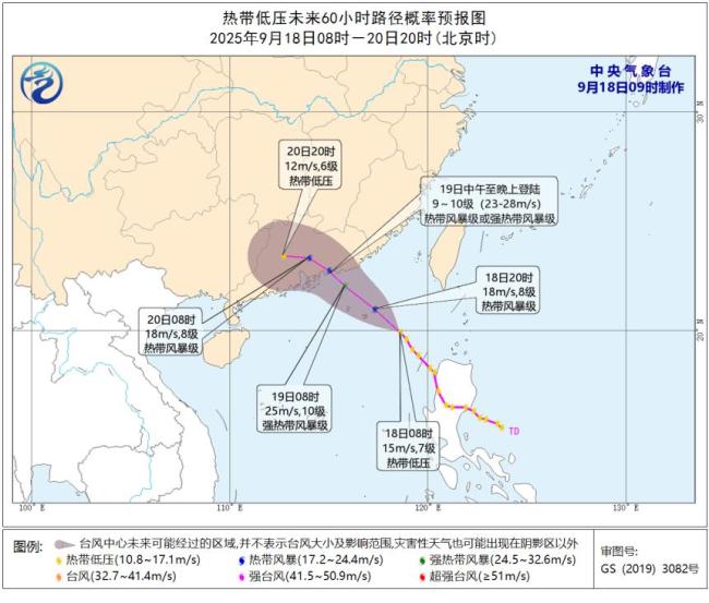 另外,菲律宾附近的热带低压昨天夜间移入南海北部海面,今天早晨8点钟其中心位于广东省汕尾市东南方约465公里的海面上。预计该热带低压将以每小时15至20公里的速度向西北方向移动,强度逐渐增强,并将于今天加强为编号台风,逐渐向广东中东部一带沿海靠近,预计将于19日中午至晚上在上述沿海登陆(23至28米/秒,9至10级,热带风暴级或强热带风暴级)。登陆后将继续向西北方向移动,强度逐渐减弱。