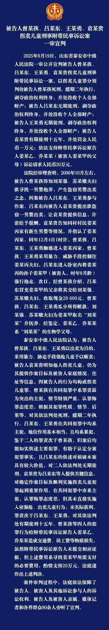 9月19日上午,泰安市中级人民法院对发生于18年前的“山东入室抢婴案”进行了一审宣判。被告人曾某孩被判处死刑,缓期二年执行;吕某东、王某勇被判处无期徒刑;袁某贵被判处有期徒刑十五年。法院还支持了附带民事诉讼原告人提出的20万元赔偿请求。