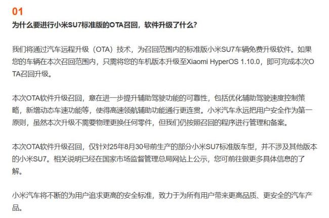 值得注意的是,本次OTA软件升级召回仅适用于2025年8月30日前生产的部分小米SU7标准版车型,其他版本的小米SU7不受影响。更多详细信息可在国家市场监督管理总局网站上查询。