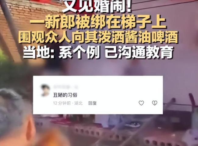 9月21日,一段视频在网络上迅速传播:新郎被紧紧绑在梯子上,啤酒和酱油混合的味道刺鼻,周围几个“朋友”拿着啤酒瓶喷洒,新郎脸上满是无奈,仿佛置身于一场荒诞的闹剧中。网友们纷纷吐槽:“这婚闹简直没法看!”