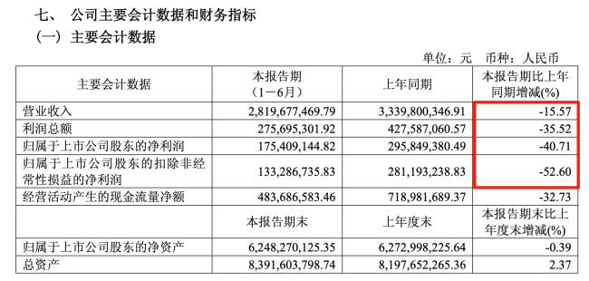 根据公司披露的2025年半年报显示,报告期内,公司实现营收28.2亿元,同比下降15.57%;实现净利润1.75亿元,同比下降40.71%;更能彰显主营业务的扣非净利润为1.33亿元,同比下滑52.6%,直接“腰斩”。
