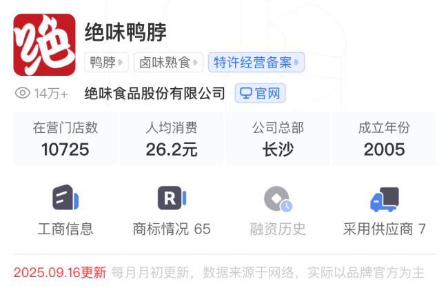根据2024年半年报,截至2024年6月底,绝味食品内地门店总数为14969家。虽然绝味食品在今年上半年未披露门店数量,但据窄门餐眼9月16日的最新数据显示,绝味鸭脖的门店数量为10725家,其中还有73家“暂停中”,而在今年4月,该机构发布的绝味鸭脖门店数量为12129家。