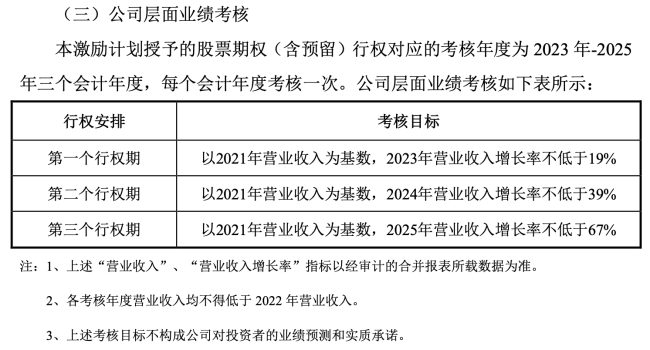 根据股权激励计划的考核目标,三个行权期为“以2021年营业收入为基数,2023、2024、2025年营业收入增长率将分别不低于19%、39%和67%。”