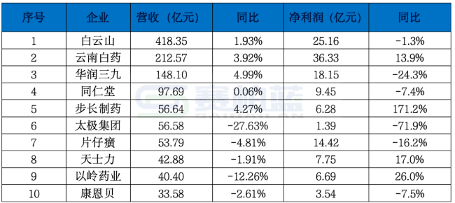2025年上半年,中药行业与医疗器械领域类似,整体表现呈现分化态势。营收规模超过百亿元的企业有三家:白云山、云南白药和华润三九。白云山营收规模最大,同比增长2%,其中医药商业占比较高;云南白药营收超过210亿元,同比增长近4%;华润三九营收接近150亿元,同比增长5%。