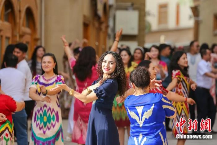 身着艾德莱斯绸的姑娘们欢快地跳着舞蹈。许晓龙 摄