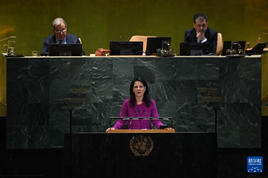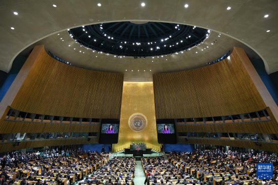 9月23日,在位于纽约的联合国总部,第80届联大主席贝尔伯克(中)主持第80届联合国大会一般性辩论开幕式。新华社记者吴晓凌摄