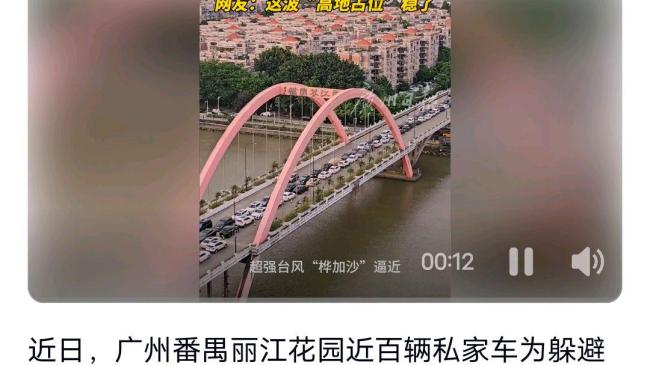 小区近百辆车停桥上防台风天泡水 高地策略应对台风。近日,广州番禺丽江花园的业主们为了躲避台风“桦加沙”,将近百辆私家车停放在小区内部的丽江大桥上。车辆排列成2-3排,单向保留了一条车道供通行。这一做法在网络上引起热议,被称为“高地占位”。