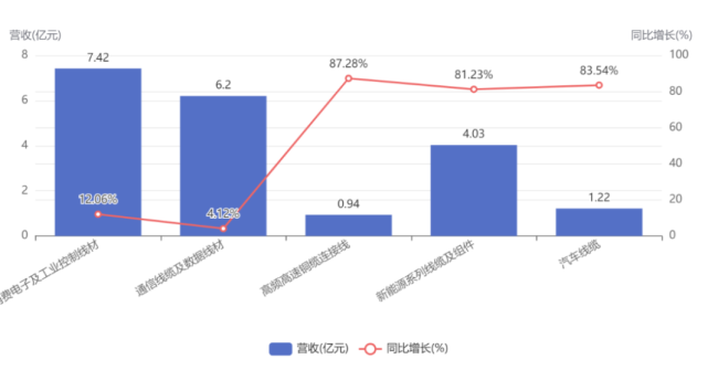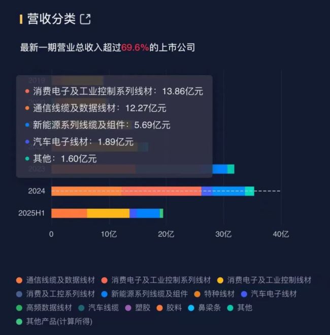 由此构成了新亚电子线缆业务的四大领域:消费电子、通信、新能源、汽车。2024年,消费电子及工业控制系列线材实现营收13.86亿元,通信线缆及数据线材实现营收12.27亿元,属于是基本盘业务。