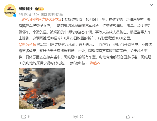 10月6日,阿维塔官方就此事表示,“具体原因还在核实当中。阿维塔06的所有车型,电池肯定都符合国家标准。阿维塔06的电池均采用宁德时代电池。”