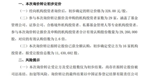 10月9日询价申购情况显示,经向机构投资者询价后,初步确定的本次询价转让价格为328.00元/股,远超前20个交易日股票交易均价的70%。以此估算,高光荣本次拟转让股份的价格约为37.49亿元。