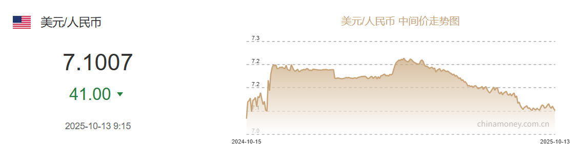 中新网10月13日电 据中国外汇交易中心网站消息,中国人民银行授权中国外汇交易中心公布,2025年10月13日银行间外汇市场人民币汇率中间价为:1美元对人民币7.1007元,上调41个基点。中国外汇交易中心网站截图