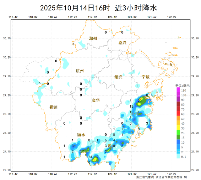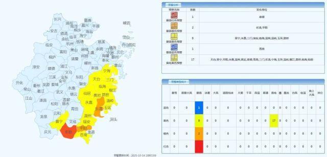 浙江降温时间公布 18日冷空气来袭!10月14日午后,浙江东南沿海地区出现明显的对流云团,伴有短时强降水、雷电和雷暴大风等强对流天气。当天16时,近3小时累计雨量最大出现在温州泰顺县大安下塔,为72.5毫米,小时雨强最大出现在温州平阳县腾蛟龙尾,为67.2毫米。泰顺县于16时19分将暴雨橙色预警信号升级为暴雨红色预警信号。