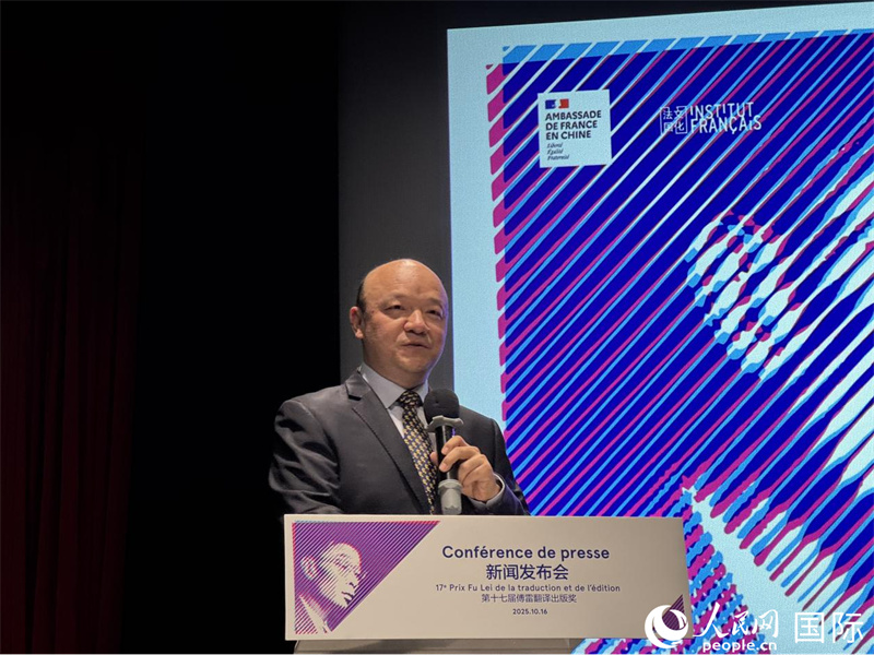 10月16日,法国驻华大使馆文化、教育与科学事务公使衔参赞艾文鸿在第十七届傅雷翻译出版奖新闻发布会上致辞。人民网 谢莹摄